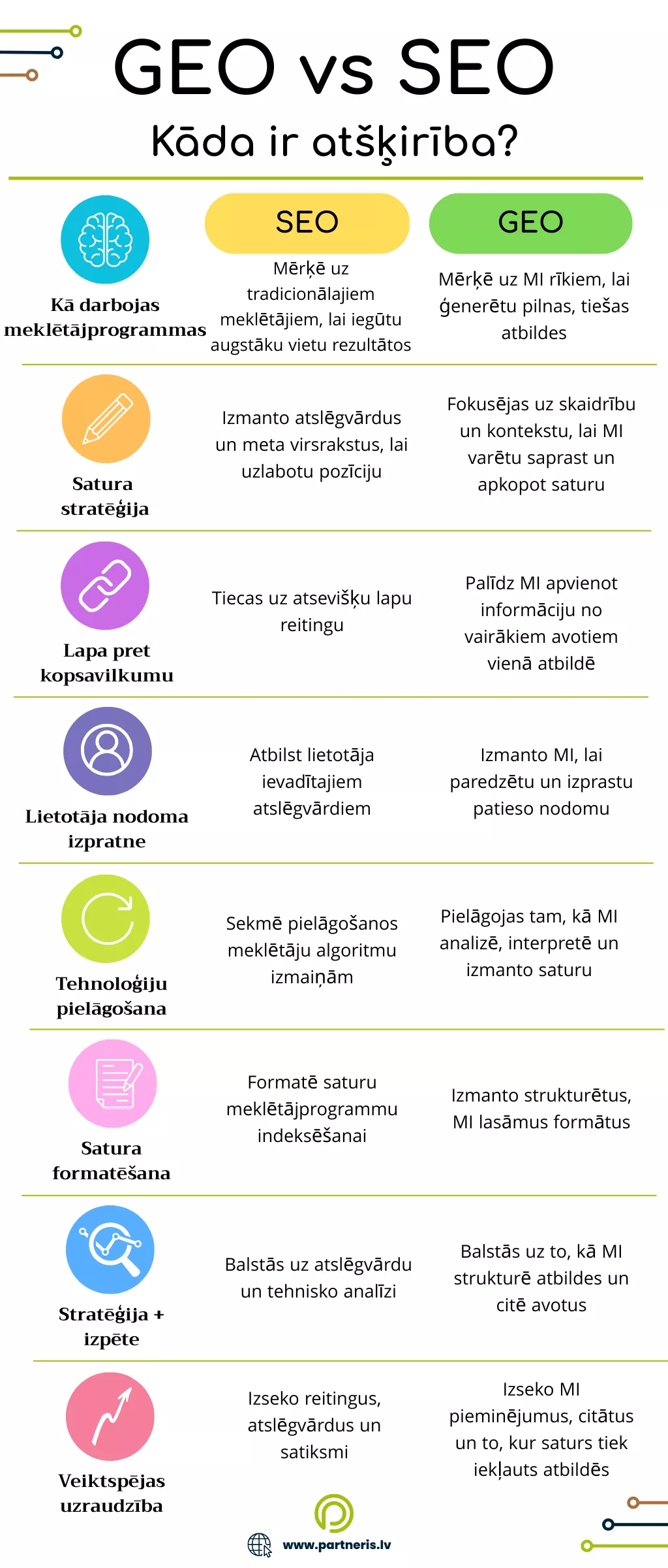 Mākslīgā intelekta (MI) darbināto meklētāju attīstība maina veidu, kā lietotāji atrod informāciju — un kā uzņēmumi vai zīmoli tiek atklāti. Šajā ainavā ir radies jauns jēdziens: GEO (Generative Engine Optimization) jeb ģeneratīvās meklētājsistēmas optimizācija. Kamēr SEO (Search Engine Optimization) jau ilgstoši ir bijusi galvenā stratēģija redzamības palielināšanai meklētājos, GEO iezīmē būtisku pāreju uz satura pielāgošanu mākslīgā intelekta ģenerētām atbildēm, nevis tradicionālajiem meklēšanas rezultātiem.