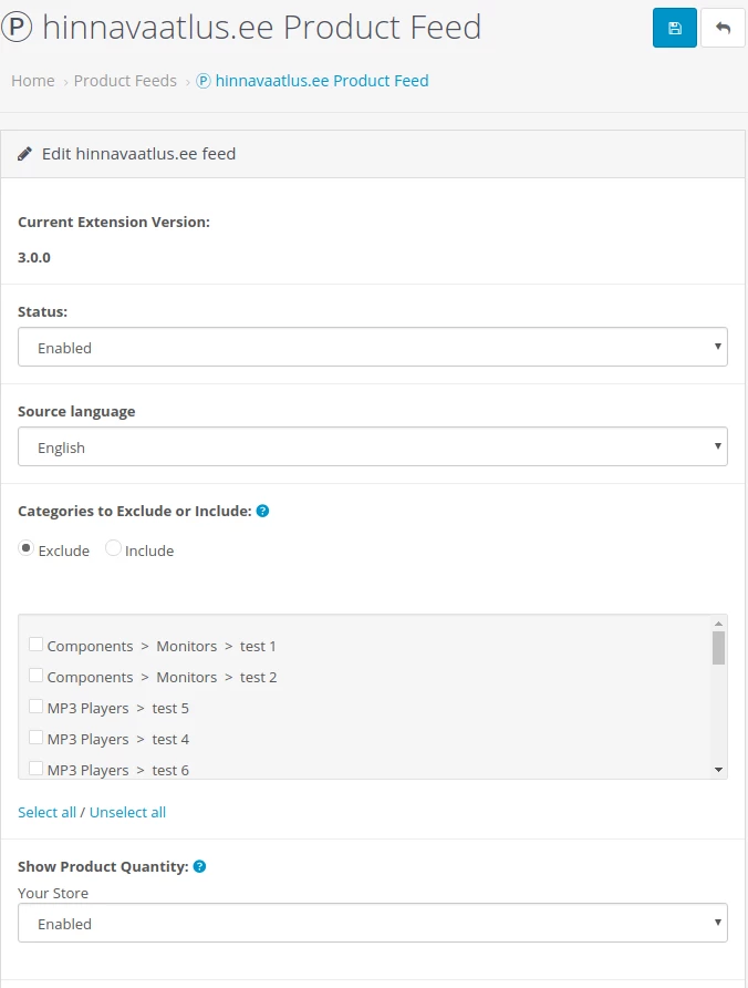 Hinnavaatlus.ee Product Feed Extension Settings Screenshot