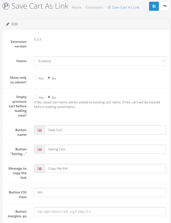 Save Cart As Link extension settings screenshots