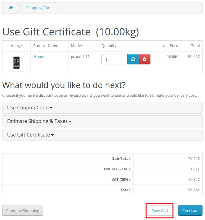 - Product code: save-cart-oc3.x