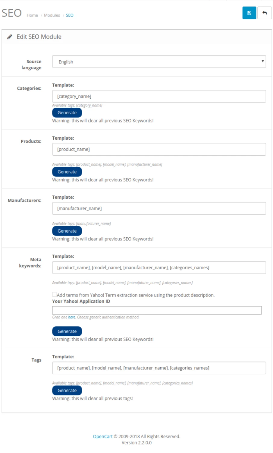 - This module will automatically generate: ✔ products SEO keywords ✔ categories SEO keywords ✔ manufacturers SEO keywords ✔ products meta keywords ✔ categories meta keywords ✔ products tags.