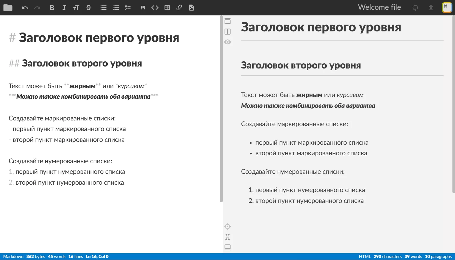 - В StackEdit вы можете написать ваш текст в поле ввода слева и сразу видеть, как будет выглядеть итоговый вариант в поле справа: