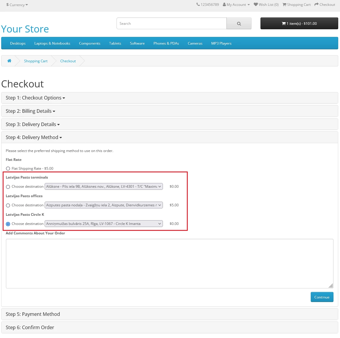 Это расширение доставки позволяет настроить доставку в почтовые отделения, станции Circle K в Латвии, почтовые терминалы Latvia Post, а также в почтовые отделения и более 100 терминалов в Литве. Клиент может выбрать адрес из списка для Латвии и Литвы.