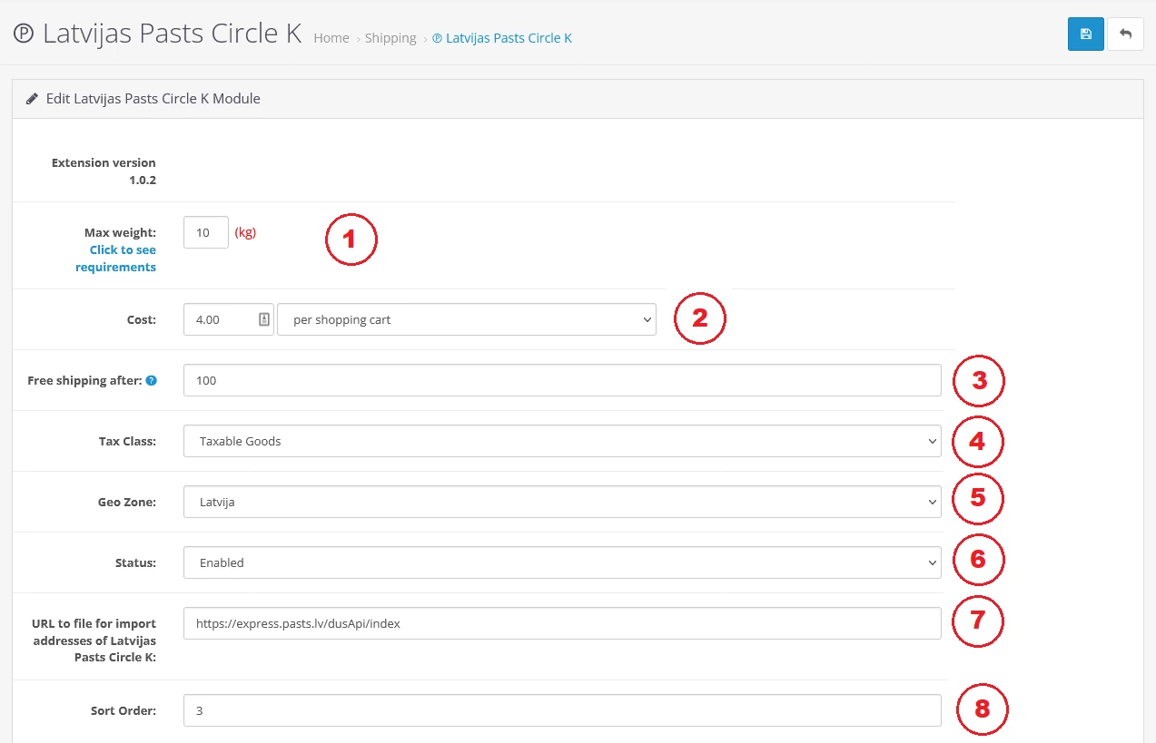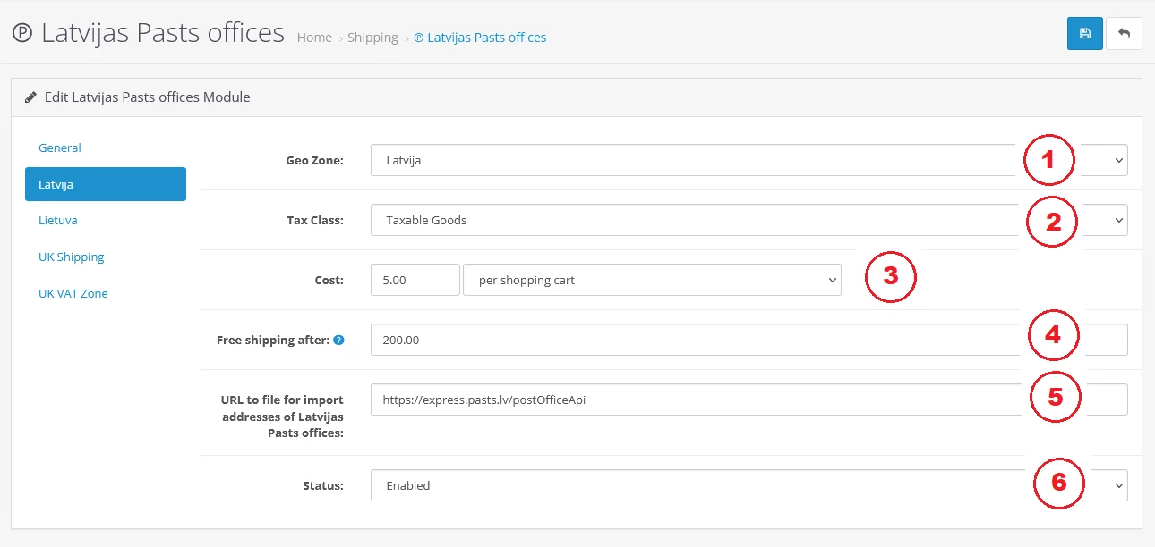 1. Настройки расширения доставки Latvijas Pasts Circle K – вкладка Общие