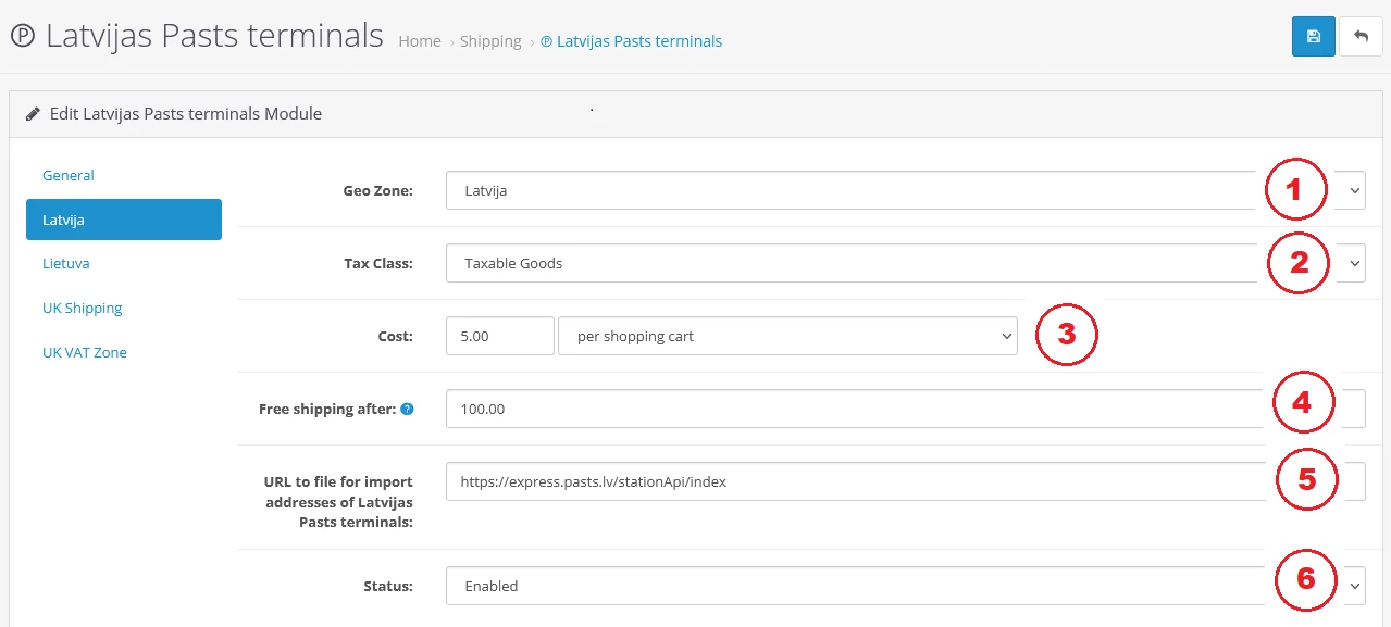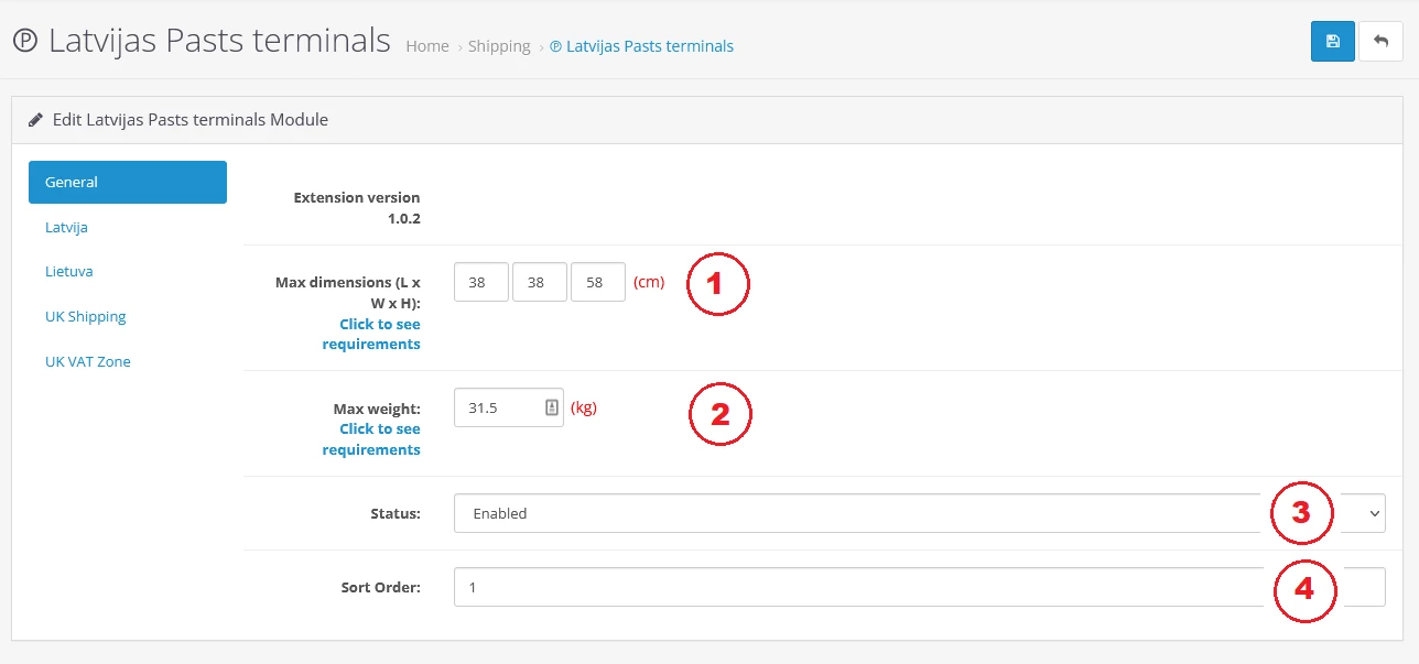 4. Настройки расширения доставки Latvijas Pasts terminals – вкладка Общие